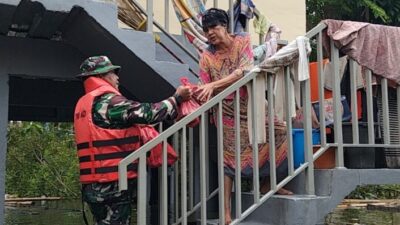 Personel Koramil 04/Babelan dan Komcad turun langsung membantu proses evakuasi warga ke tempat yang lebih aman serta memastikan keselamatan masyarakat terdampak.